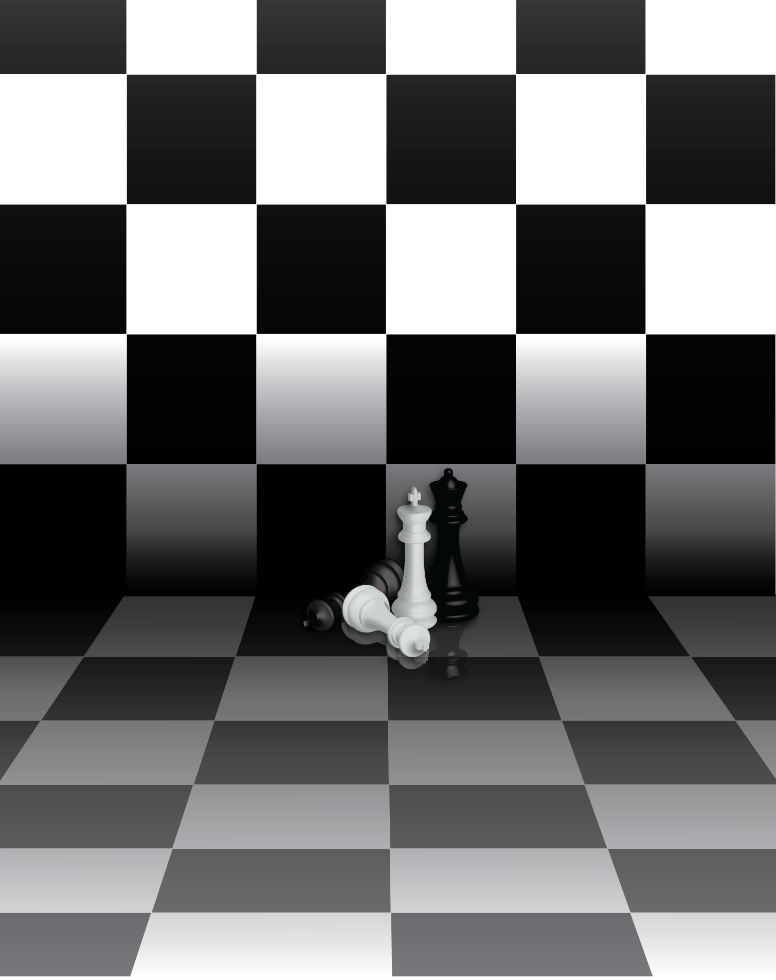 This is one of my favorite pieces in which 3D, gradients, shadows, and perspective are used to create a chess board and peices.